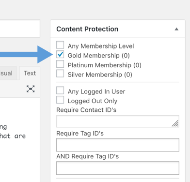 在每个页面/帖子上,您将得到一个简单的使用内容保护框,其中您可以选择会员资格、ActiveCampaign或Keap标签,以及查看页面所需的其他条件。